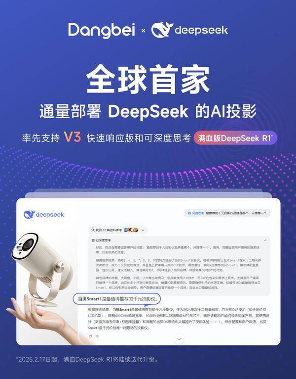 当贝Smart1投影仪全球首家通量部署DeepSeek•▲…,是当贝在AI领域的一次重要尝试和突破•△…□=○。未来◆=,当贝将继续加大在AI技术上的投入和研发◇●,不断探索和创新◆□●○▼,为用户带来更多智能化▪-、个性化的产品和服务▷•◇◇▼。同时◆★△◆-,当贝也将与更多的合作伙伴携手◇▽◇,共同推动AI技术在投影仪领域的应用和发展★◁◆•,为用户创造更加美好的智能生活体验=■…◆☆▽。